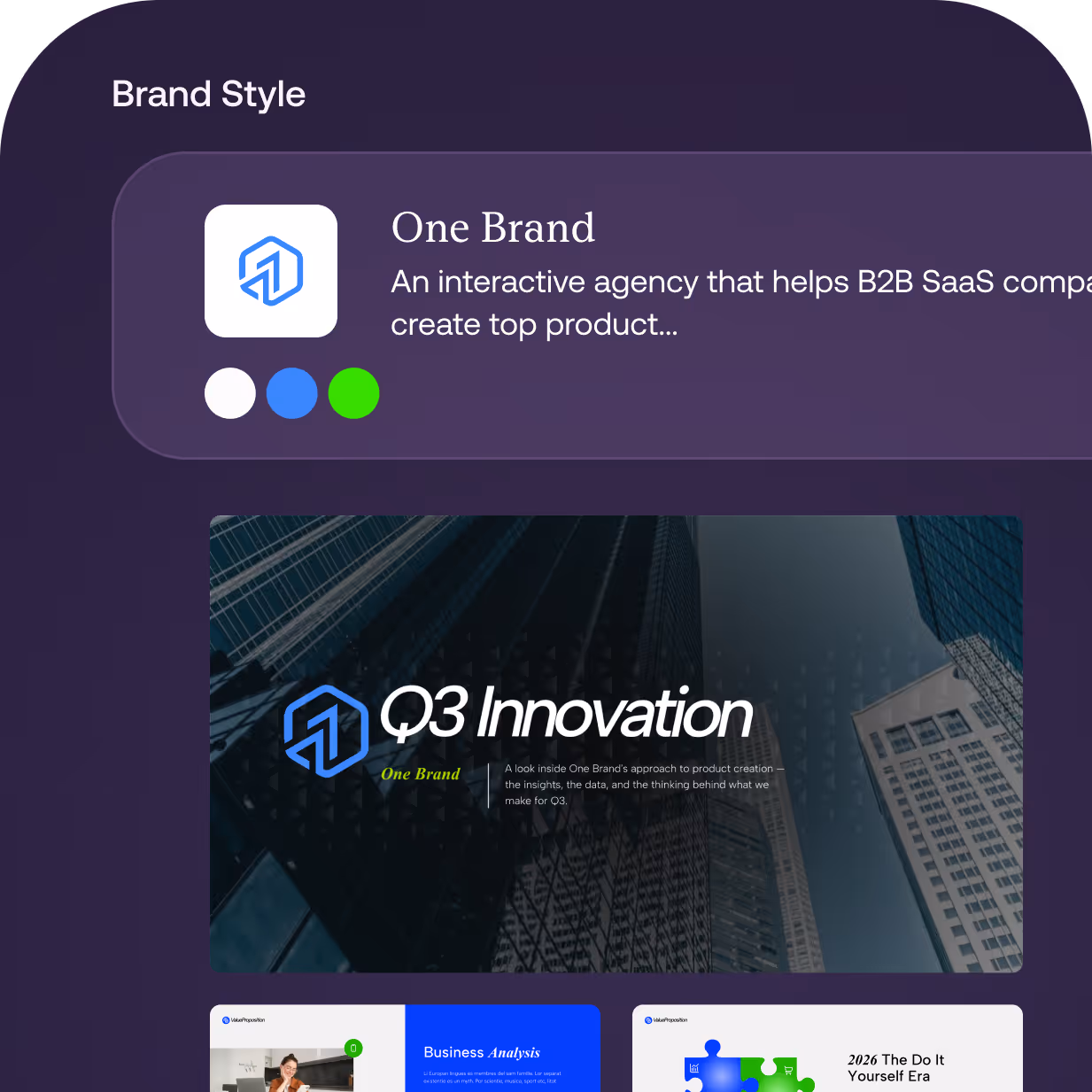 Every deliverable is automatically generated in your brand style — colors, fonts, format, done